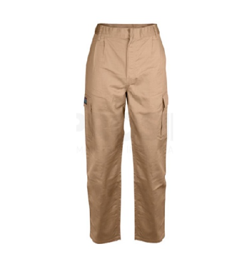 PANTALÓN CARGO FR CANELO Pantalón confeccionado en tela Beige con una tribanda blanco CERTIFICADO N° 20/2380/00/0161 Pantalón con reflectante Gabardina Ignífuga 88%algodón – 12%nylon 11 cal/cm2