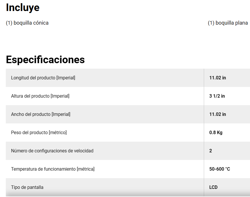 La Pistola de Aire fue diseñada para fácil uso. Su peso liviano no causa fatiga durante aplicaciones prolongadas. Su pantalla LCD ayuda a establecer la temperatura deseada. Incluye dos accesorios y cuenta con 1 Años de Garantía Limitada,