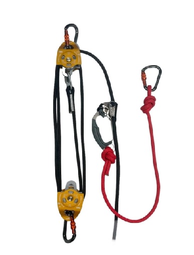 Kit contiene 1 un Anilla Open Sling 14mm 25 KN- 120cm 2 un Polea Doble – Twin Roll 36KN Black 1 un Maillon Acero 1/2 1 un Ascendedor Cuerda Lift Derecho 3 un Carabiner Alu. Hector 3 Tiempos (HMS) 30KN Black 150 mts Cuerda Static Ø 11mm 1 un Bolso 70lt porta equipo