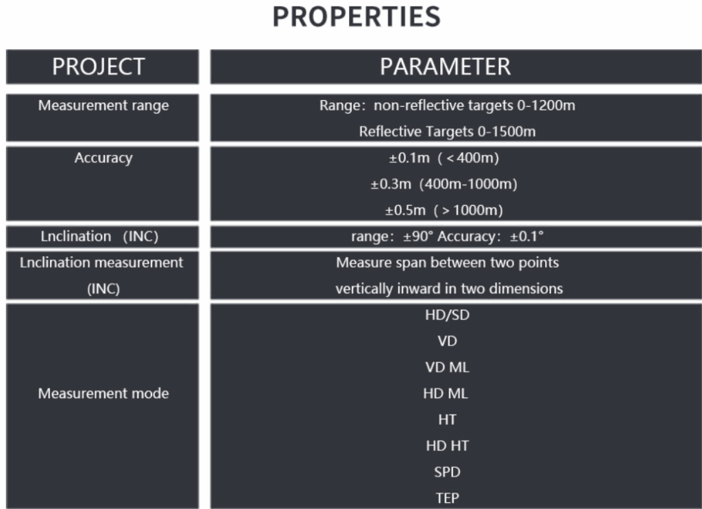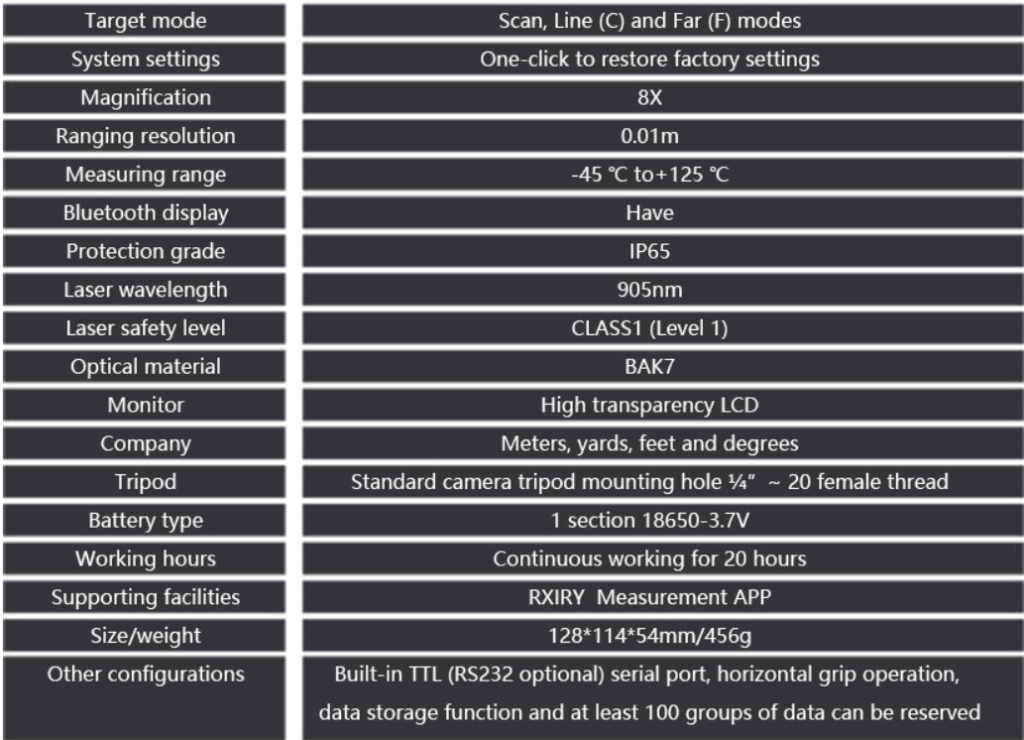 Este versátil láser de mano mide mucho más que solo el distancia. CLASSIFICATION:XR SERIES MEASUREMENT ACCURACY: ±0.1m(<400m) ±0.3m(400m-1000m) ±0.5m(>1000m) MEASURING RANGE: Non reflective rangefinder 0-1200m Reflective range 0-1500m SPECIFICATION:126*114*54mm